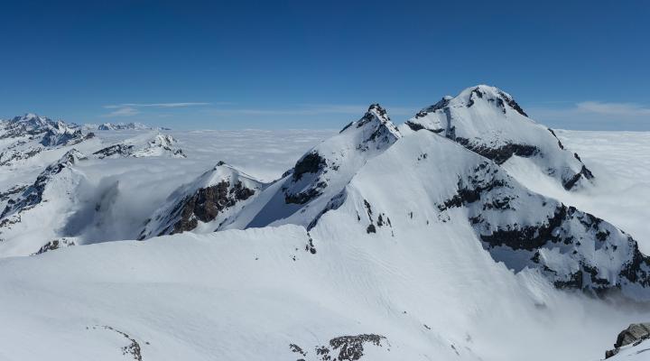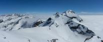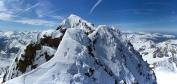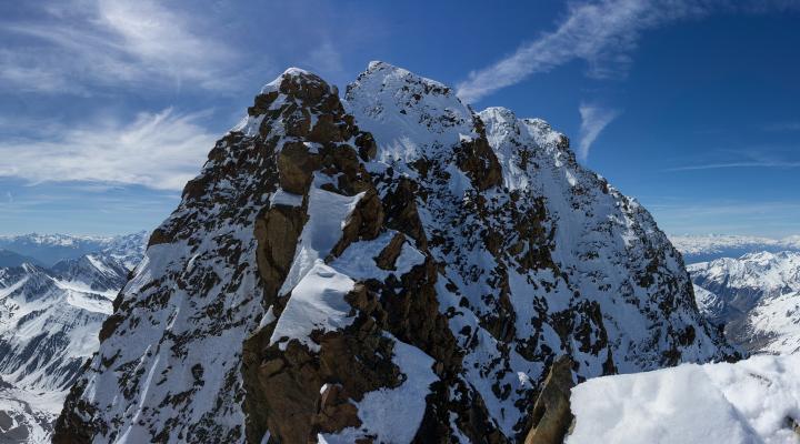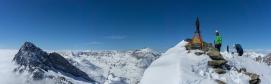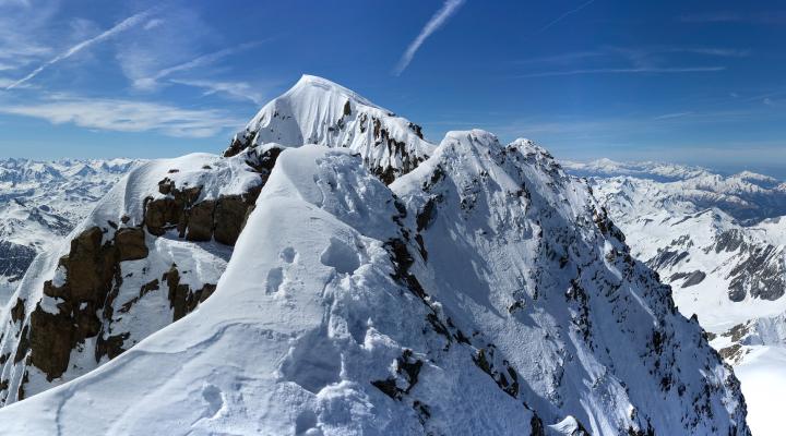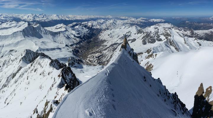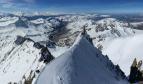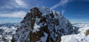Les conditions sur la partie sommitale de l'arête deviennent nettement plus compliquées que pendant la montée versant sud : il n'y a pas de neige dure mais seulement une vingtaine de cm de poudreuse qui recouvre les rochers. La présence de petites corniches très fragiles n'arrange rien, mais le panorama somptueux compense très largement ...